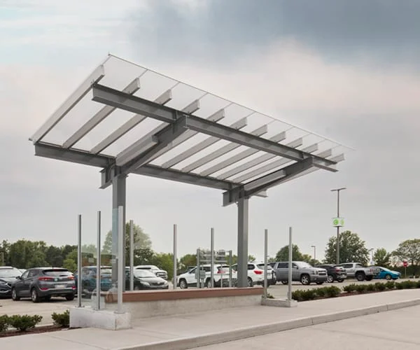 This system features extruded aluminum clamping rafters that tightly hold the glazing in place. The combination of standing seam polycarbonate and the aluminum clamping system allows for long spans. The canopy also features a gutter system to manage precipitation. Structural beams and columns were factory fabricated by EXTECH for ease of installation. For further wind protection, EXTECH provided a 6’ tall, u-shaped glass wind breaker to surround the canopy area.