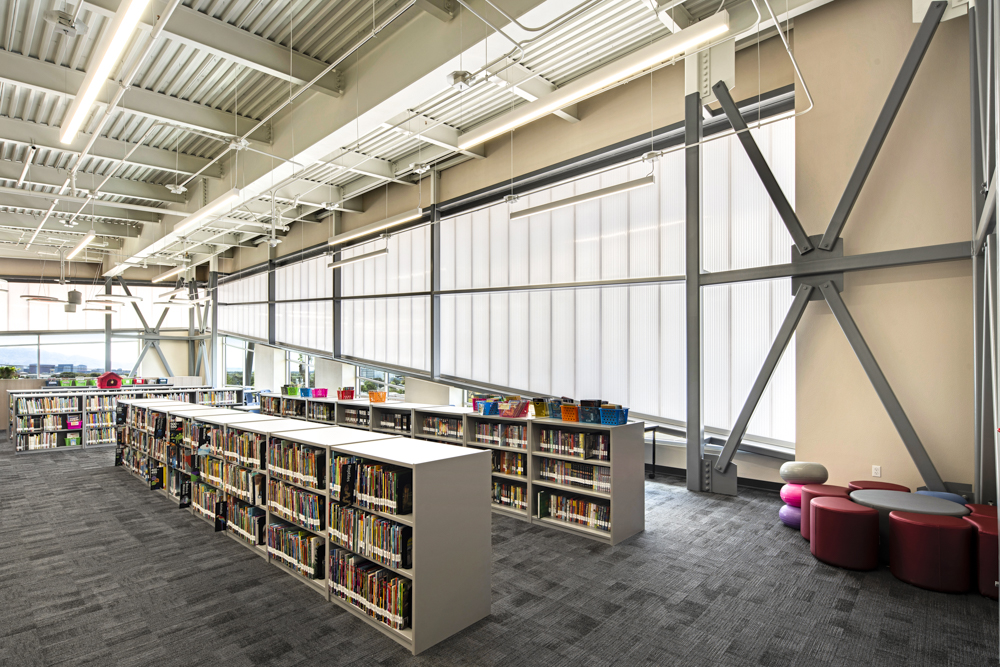 - 30% light transmission of the opal polycarbonate panels provides diffuse daylight without glare or hot spots. This is critical in a library setting where visual comfort matters.
