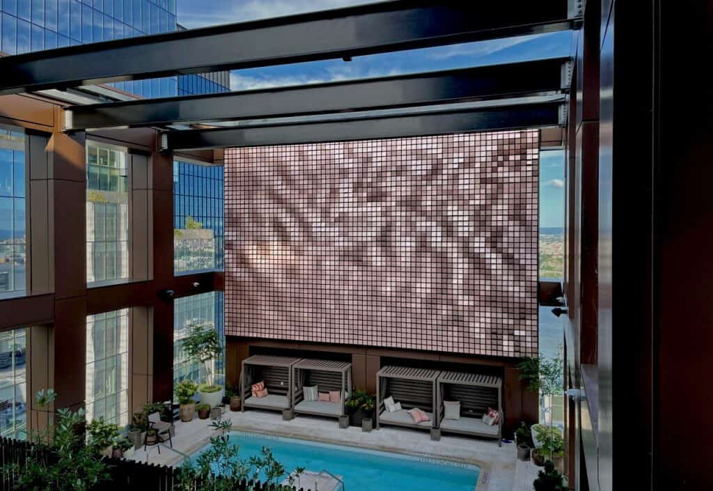 Located on the 43rd level of the 45-story apartment building, the 944 square-foot artistic wall was designed by environmental artist Ned Kahn and created with a custom engineered KINETICWALL® manufactured by EXTECH/Exterior Technologies, Inc. The 38’3” L x 24’8” H feature is the highest vertical installation by EXTECH to date and, as touted by “The Set” website, is the icon of the building’s “private social club 43 stories into the sky”.
